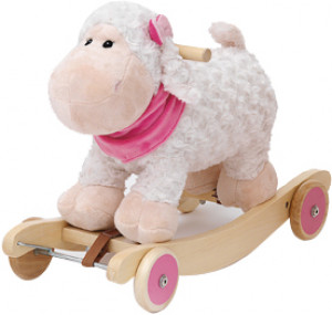 Av mormor: Ett gunglamm! Det skulle ha ett läte också, så vi satte i batterier och tryckte på örat... Men inte var det något vackert bräkande inte, det var någon hillbilly tjosanvisa som Majken nästan blev rädd för! Härom dagen när jag tryckte igång melodin klättrade hon raskt upp i mitt knä och småkikade på lammet lite skeptiskt... Annars älskar hon lammet, pussade och gosade med det direkt :)